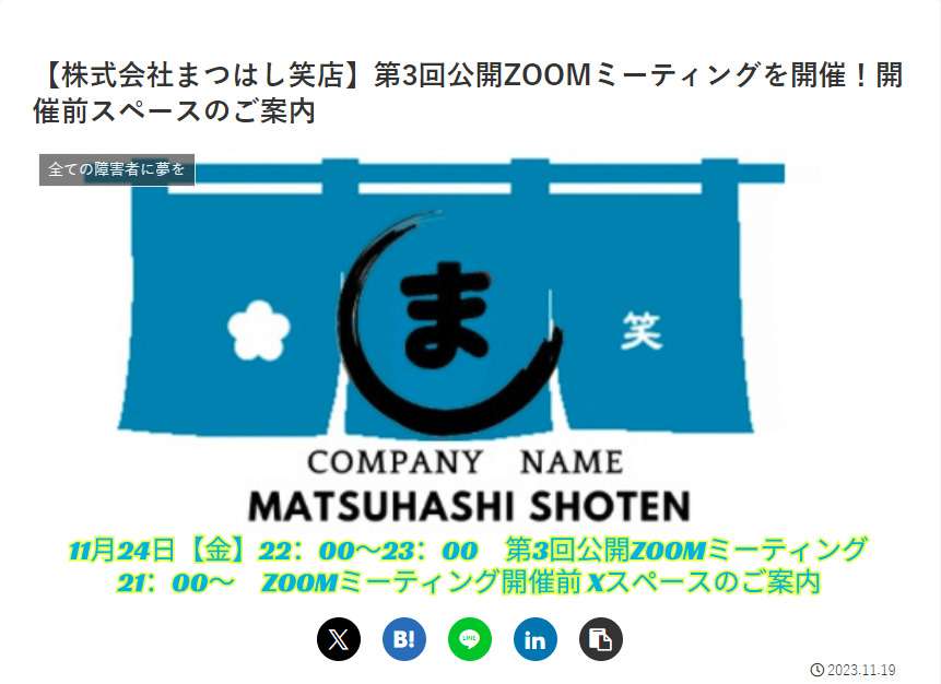 【公式ブログ】株式会社まつはし笑店に、新しい記事が掲載されました。不定期に行っている、第3回目となる公開ZOOMミーティングの記事になります。詳細は上記バナーリンクをクリック又はタップすることで、ブログ記事を閲覧できます。